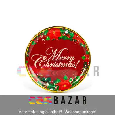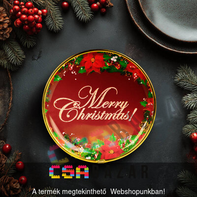 A 22 cm átmérőjű, „Merry Christmas” felirattal díszített tányéron klasszikus karácsonyi motívumok – mikulásvirág, fenyőág, toboz – jelennek meg.